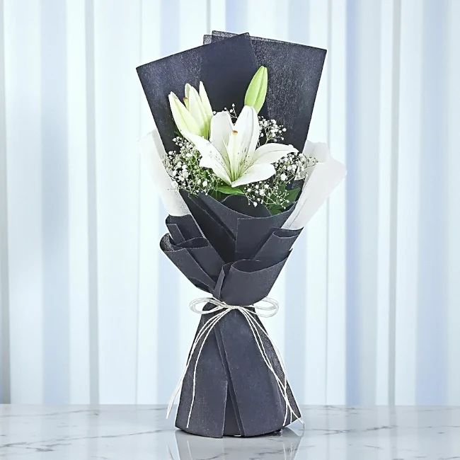 The Lily Flower Bouquet from The Gift Shop UAE is a symbol of purity, elegance, and love. It features fresh 3 white lilies beautifully paired with delicate white gypsophila and lush green fillers. Wrapped in sleek black paper, this bouquet creates a striking contrast that enhances its sophistication. Perfect for birthdays, Women’s Day, Daughters Day, Mother’s Day, Father’s Day, or any special occasion, it expresses heartfelt emotions with style. Moreover, the soft fragrance and refined look make it an unforgettable gift choice. Surprise your loved ones in the Al Ain with this graceful bouquet and make their day extra special.