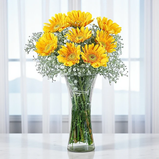 Bring joy and positivity with the Sunshine Smile from The Gift Shop UAE. This bright and cheerful arrangement features vibrant 8 yellow gerberas paired with fresh White Gypsophila, symbolizing happiness and warmth. Perfect for lifting spirits and spreading smiles, it’s an ideal gift for Birthdays, Women’s Day, Daughters Day, Mother’s Day, Friendship Day, or any special occasion. Share sunshine and love across the Al Ain with this radiant bouquet that celebrates life’s happiest moments.